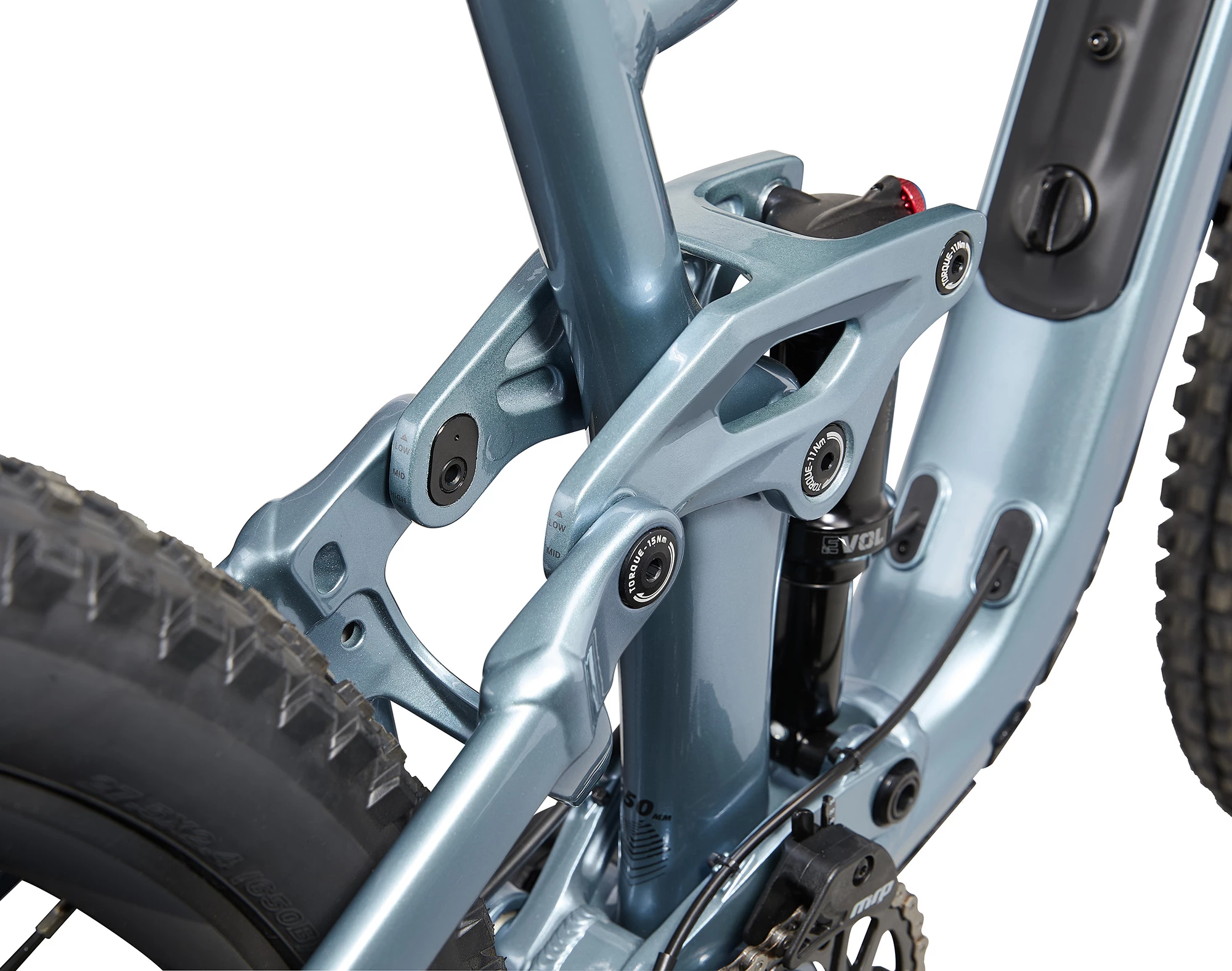 | Pneus | [F] Maxxis Minion DHF 29×2.5WT, 3C Max Terra, EXO, TR, tubeless [R, size M and L] Maxxis Dissector 29×2.4WT, 3C Max Terra, EXO, TR, or [R, size XS and S] Maxxis Dissector 27.5×2.4WT, 3C Max Terra, EXO, TR, tubeless | |